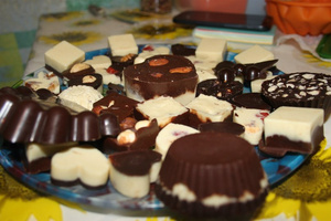 Понимаешь, я тут стол поменяла на кухне, он маленький, совсем на нем не удобно работать с шоколадом. Да и плиту надо мраморную. Или хотя бы стол должен быть металлическим, как у шоколатье во многих МК. С холодильником мне не понравилось темперирование, не то это, нужна плита. Очень хочу освоить, но пока не получается. Пока времени нет описать события и процесс, а фотки не могу скинуть с телефона, провод потеряла, надо покупать. Напишу, скину, как время будет.