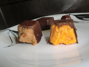 обещала давно фотки корпусных конфеток-первый опыт....вот они, после морозилки, начинка напомню - сливки снятые с дер.молока и курага/чернослив, погружным блендером до кремообразной массы