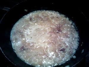 В сковороде луковица и цельная банка тушенки, которая превратилась в воду... То что выглядело как мясо тоже раствор лось без следа, вот такая занимательная химия......