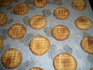 Достать тесто, разделить на кусочки и скатать шарики размером с грецкий орех. Затем обвалять шарики в смеси сахара и корицы, выложить на противень, застланный бумагой для выпечки. Надавить на шарик вилкой крест-накрест, чтобы он немного сплющился. Выпекать примерно 15 минут при t-175.