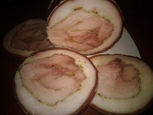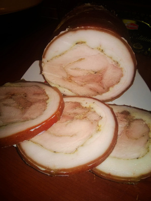 кусок мышцы с задка я разрезала его по принципу "улитки" в длинный пласт - соль, перец, специи, чеснок, соевый соус, горчица по вкусу (соль уже перед тем как варить) намазать и полежал пару тройку часов...потом свернуть рулетом обратно в целый кусок, обернула шкурой, в пакет для запекания и в ветчинницу, в кипящую воду на 1.5 часа, выключить и остудить в этом же бульоне ( я потом собакам кашу варю на нем)..еще пару часов в холодильнике и готово. Резать можно оооочень тоненько - ничего не разваливается, просто моему мужу было лень, он тоненько не есть, он ломтями))))