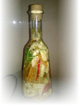 Тоже хочу такую красоту в свою кухню.Сама я еще не делала - но, как понимаю, технология простая - в пустую бутылку запихиваете какие любите травки, чеснок режете и перец чили. И заливаете всех этот 4%-ным уксусом (брат именно таким заливает). Настаиваете неделю-две. И можно употреблять в пищу. Когда уксус закончится - снова заливаете