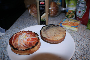 Пока обжаривается, кидаем на нижнюю часть лучок, помидорку и котлееетку. Сверху сразу ломтик сыра, чтобы подтаял, салатик и верхушку.