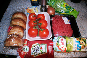 Надо че, фарш, помидорку, луковку, салат, кетчуп и соус, и сыр.