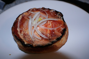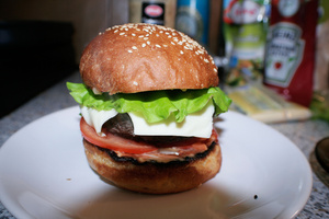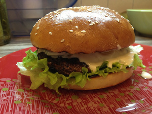 Только лук режу кольцами и мариную в бальзамике или просто уксусе минут 5 - остринку дает такой лучок. И огурец маринованный тоже туда в тему.Повторил только что. Весьма. Правда у мну не так эстетично получилось ибо торопился, да и спецдевайса для формовки гамбургерной котлеты нет. Вкушалось еще более пошло - под пиво. Пиво было также вкусное. Резюмируя могу сказать, что вкусная, но не диетическая пища на сегодня восторжествовала.