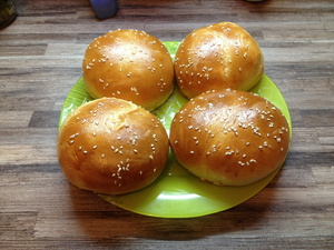2. Булки всегда делаю сам. Причем в последнее время сырные. 250 мл теплой воды, половину пакетика сухих дрожжей, полчайной ложки соли, столовую ложку сахара, примерно 3,5 стакана муки через сито+150 г, к примеру, тертого маасдама. Замешиваем тесто, обычно использую хлебопечку. Поднимаем его, выкатываем булочки. Расстаиваем, смазываем яйцом+кунжут и выпекаем минут 18. Готово. Если духовка плохая, то яйцом лучше смазать минут за 5 до готовности. И тогда же посыпать кунжутом. Да, их потом надо разрезать и закарамелизовать на сухой сковороде или гриль-сковороде.