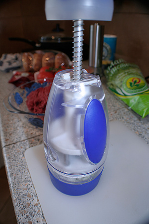 В фарш лук, соль, перец и яичко. Яичко обязательно, а то развалится к п. 5 котлета. От луковицы берем 3/4 и с помощью космического дивайса без слез измельчаем. А одну четверть режем перьями(кому и полукольцами нравится).