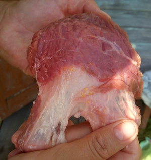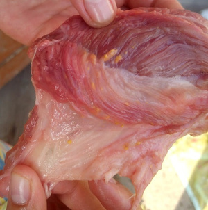 Было куплено охлажденным, потом заморожено. Стали резать, внутри ткани, преимущественно под пленкой желтые вкрапления разной величины, упругие.