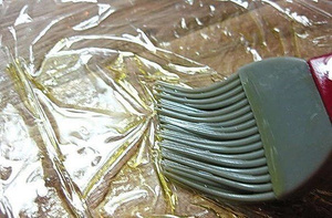 2. Пленку разложить на доске и смазать оливковым маслом. Пленку выложить на небольшую пиалу, в углубление вылить яйцо (по желанию можно сразу посолить или оставить право выбора едоку за столом).