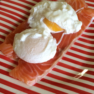 6. Мешочки с готовыми яйцами вынуть из воды, аккуратно снять пищевую пленку и выложить яйца-пашот на блюдце."