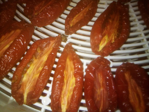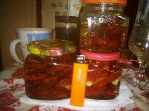 помидоры взяла "сливка", срезала хвостики, разрезала пополам, присолила и поставила вялить. сначала на невысокую температуру и постепенно добавляла до 70 градусов, помидоры вялились 2 дня с перерывом на ночь. потом простерилизовала баночки, порезала чеснок, уложила слой помидор, залила хорошо разогретым маслом с травами (орегано, базилик, розмарин) и опять чеснок, помидоры и масло. все придавливала ложкой. остыли и поставила в холодильник. было 3 поддона сушилки и вот сколько получилось. Хочу сказать что очень вкусно даже просто помидорку с маслом просто на кусочек свежего хрустящего багета