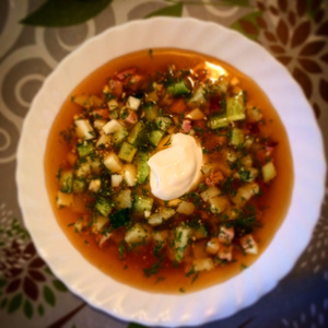 Последнее время предпочитаем окрошку на кефире 1% пополам с водой и чуть сахара добавить. А сметану добавляем только если делаем на квасе. Вот только квас какой-то невкусный все попадается, а сами не ставим..А чуть позже будем делать гаспачо))