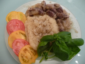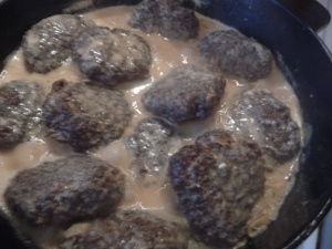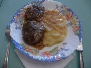 печёночные котлеты той же фирмы. Во первых запах именно говяжьей печени пошёл сразу. Я их мороженными обжарила в масле, (быстро на огне).. в том же масле обжарила опять много лука ( слила лишнее из сковороды)- в лук сметаны, воды соль, перец. и котлеты туда подтушиться))) минут на 7-10.. и картошка пюрэ.. выглядит не очень- но это вкусно!!! Всё Я БАРЫНЯ!!!