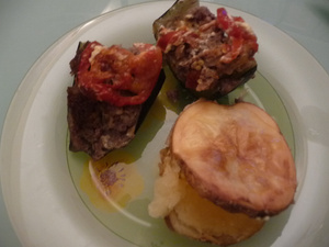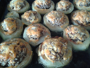 Кабачки с мясным фаршем, запеченые в духовке. Рис слегка отварила, лук мелко порубила, смешала с домашним фаршем, специи по вкусу. Заполнила фаршем очищенные кружочки кабачков, выложила на лист, сверху можно смазать кетчупом, майонезом или положить кружочки помидора, (но в тот момент их у меня не оказалось