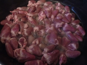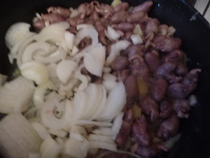 Сердечки куриные. и взбитая картошка- ПЮРЭ!!! (много лука в сердечках.. и сверху на картошке чёрный молотый перец)