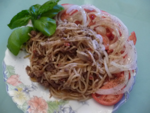 рано приготовила, но это и будет ужином. Макароны по флотски_ Вместо макарон спагетти, фарш тушила с большим кол-вом помидор, болгарского перца, лука, чеснока. получилось бы паста, но я захотела всё смешать.. спагетти альденте - не раскиснут. Ну и резанные с луком помидоры в оливковом масле. рядом в прикуску..(не люблю салат последнее время мешанный, режу индивидуально в тарелку)