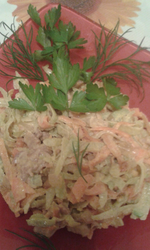 Мама моя его делала когда-то просто- редька на терке, лук поджаривать, мясо кусочками и майонез.