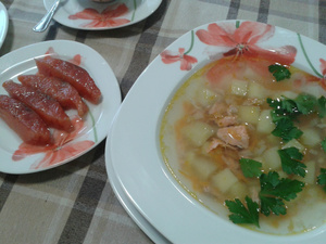 Так уж повелось с советских времён, что четверг - день рыбного поедания. Недавно прочитатала , что днем "рождения" рыбного дня стало 12 сентября 1932 года. Сегодня хоть и не 12, а 22 сентября, но четверг. У меня на кухне случилось простое совпадение. Пару дней назад была куплена кета весом 1,4 кг. Филе засолили (соль, сахар, черный молотый перец), уложили в емкость и залили маслом. Все что осталось от тушки рыбы пошло на уху.
