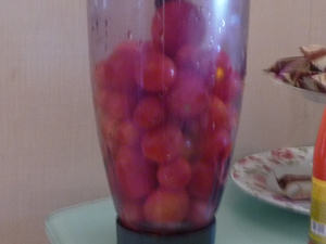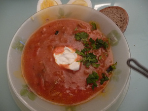 СУП сваренный на одном томатном соке .,((( варится на взбитых в блендере помидорах+ добавила острый перчик ! (если сильно густо, то можно воды добавить. И сахара вместе с солью по вкусу!!!))), как на томатный сок.- картошка, капуста свежая, болгарский перец, лук.- Я "припустила лук и морковь). --(это кому помидоры девать не куда!!!)- вкусненько получилось, Подавала со сметаной и кинзой., варёные яйца.- в прикуску были запечённые рёбрышки маринованные.