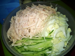 огурцы - порезать соломкой, куриное филе отварное раздербанить на волокна, яйцо вареное - пластиками, лук (лучше красный салатный - так красивее. у меня в этот раз не было) полукольцами потоньше. Заправить майонезом, украсить зеленью..