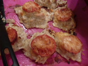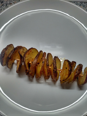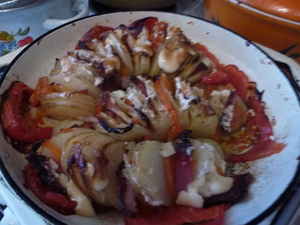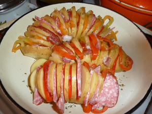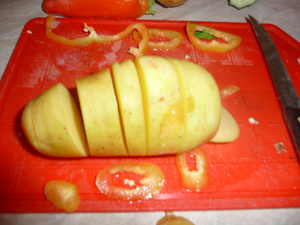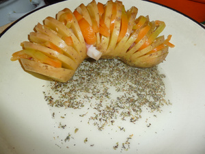 Фото старое, но я сново это делала на выходных, (((с баклажаном по совету прекрасной Елены- нордика. !!!))) здесь всего 3 клубня картошки., разрезаем не дорезая до конца гармошкой каждую. получается БАЯН