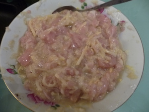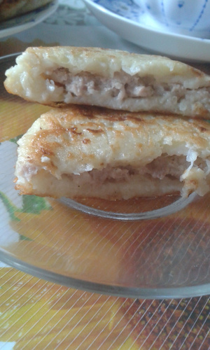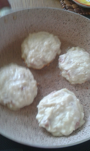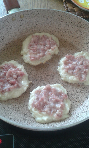 В субботу на второй завтрак перед обедом нажарила моих любых, и не только моих- драники-колдуны. В этот раз (раньше так никогда не делала, а зря!) смешала тертый кабачок и картошку, между ними фарш (тоже сама крутила- говядина, свинина, сало, лук, чеснок и потом еще 2 куриных грудки докрутила, показалось что с салом переборщила, и правильно сделала).