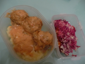 а у меня ужинать не с кем))) муж приедет поздно.. а я ему вот что на завтра приготовила.. - тефтели крупные тушёные в томатном соусе со сметаной.. , пюрэ и вчерашняя шуба. всё в баночках уже.. Вот так!!! мой ужин