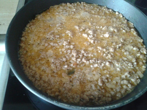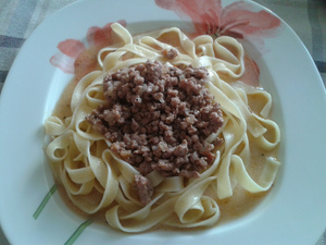 Сегодня на ужин фетучини с мяском. Обжариваем одну большую очень мелко порубленную луковицу, туда же резаный помидор без кожицы, соль, смесь перца, лавровый лист. Выкладываем сверху 500-600 гр. фарша (говядина+свинина) и перемешиваем. Еще добавила сушеный базилик. Закрываем крышкой и тушим. Ну и в завершении стакан сливок. Немного томим на слабом огне, в это время отвариваем пасту. Получается вот это: