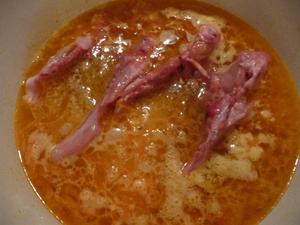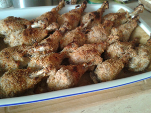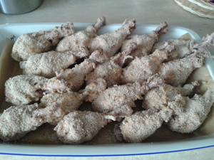 Сегодня на поздний обед-ранний ужин будут куриные ножки "бон-бон". Куриные ножки отварить до полуготовности в подсоленой воде, зачистить снизу косточку, так эстетичнее выглядит и брать кушать удобненько. Далее нужно сдобрить любимыми специями и завернуть каждую ножку в тончайший кусочек бекона. Но я сегодня без бекона... поэтому я сделала кляр (яйцо, молоко, мука), обваляла в специях и панировочных сухарях. Ножки буквально "поставила" в форму и отправила в очень хорошо разогретую духовку. Вот что получилось (фото "до" и "после").