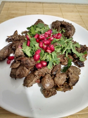 И Кучмачи - куриная печень, вымоченая в вине, жареная с помидорами, луком, специями, чесноком