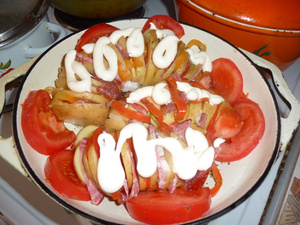 в промежутки между слоями складываем что бог послал!!! но обязательно либо курдючное сало добавляем либо тонко нарезанный бекон. на этом фото у меня армовирская колбаса, чуть бекона, помидоры, и что- то там ещё.. Всё вкусно.. баклажаны вообще безумно понравились- принцип тот же, только помидорочки обязательно!!! и зелени в конце побольше. мне удалось достать именно курдючное сало, и это была фантастика!. Но с беконом тоже будет вкусно.
