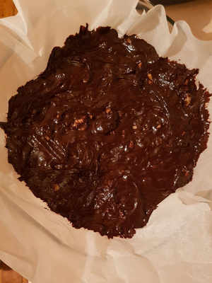 4. Добавить сгущенное молоко и орехи, тщательно перемешать и выложить в форму, выстеленную пергаментом. У меня форма квадратная со сторонами 30*30 см. Получившаяся масса легла слоем толщиной примерно в 1,5 см.