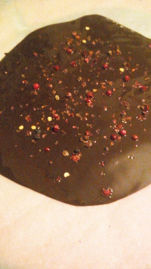 Шоколад растопить на водяной бане, добавить соль, перец чили, вылить на лист пергамента,посыпать розовым перцем и дать остыть.