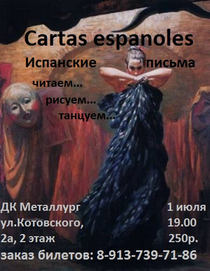 1 июля в ДК Металлург состоится программа "Cartas espanoles" - "Испанские письма". Вы увидите новые танцевальные номера от студии фламенко ELEGANCIA. Интригу вечера составят драматическая и художественная составляющая программы.