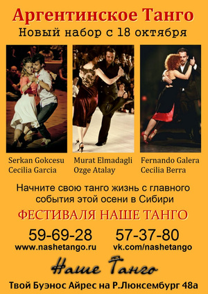 В этом месяце у вас появилась уникальная возможность начать свою интересную танго жизнь с крупнейшего танго события Сибири и Урала - большого фестиваля "Наше танго", который проходит при поддержке правительства Аргентины. Свои мастер-классы и танго шоу представят три всемирно известные пары маэстрос из Буэнос Айреса и Стамбула. В фестивале примет участие атташе по культуре посольства Аргентины. А участники-танцоры едут изо всех городов Сибири и Урала, и даже из более отдаленных мест.