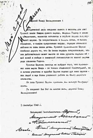 Когда Сталин, чтобы воспользоваться патриотическими и религиозными настроениями русских людей в войне с Германией, приказал открыть некоторые из закрытых храмов и допустил выборы "Патриарха" в 1943 г., начался новый период в отношениях Церкви со властью, тогда Московская Патриархия превратилась фактически в "официальную Церковь" советского государства, распространяя коммунистическую пропаганду по всему миру во имя религии и категорически отрицая наличие любого вида притеснений за веру в Советском Союзе. ....