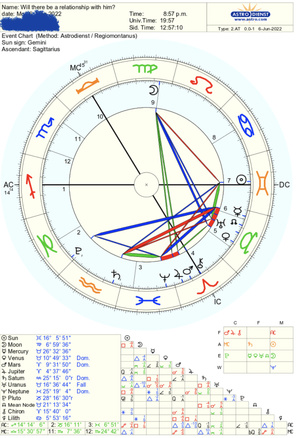 Ваша планета стоит в 8 доме- дом означает большое напряжение, стресс. Конечно в таком положении не до любовных отношений. Несмотря на то ,что Луна как ход дела делает сходящийся секстиль к вашей планете все же я скажу что скорее отношений любовных в 2022 не будет, чем будет.