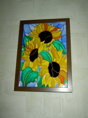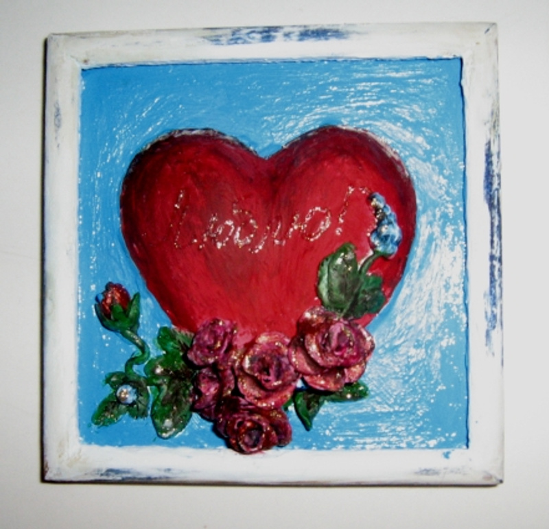 Объемная картинка, сердце и цветы объемные вылеплены в ручну. На сердце надпись блестками "Люблю"