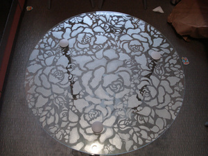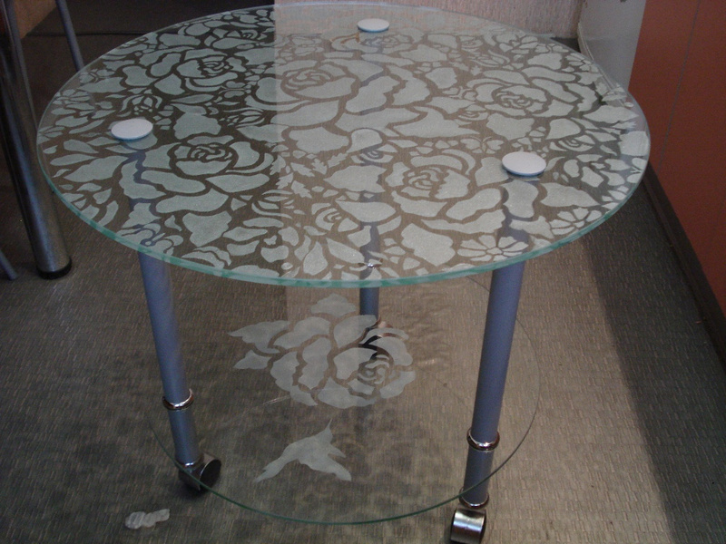 Продам стеклянный столик. Высота 530мм. Размер столешни 600мм, толщина стекла 8мм, нижняя полка - 500мм, 5мм. Ножки на роликах, высота полки регулируется. Ручная роспись на внутренней стороне стола красками по стеклу "серебряный иней".