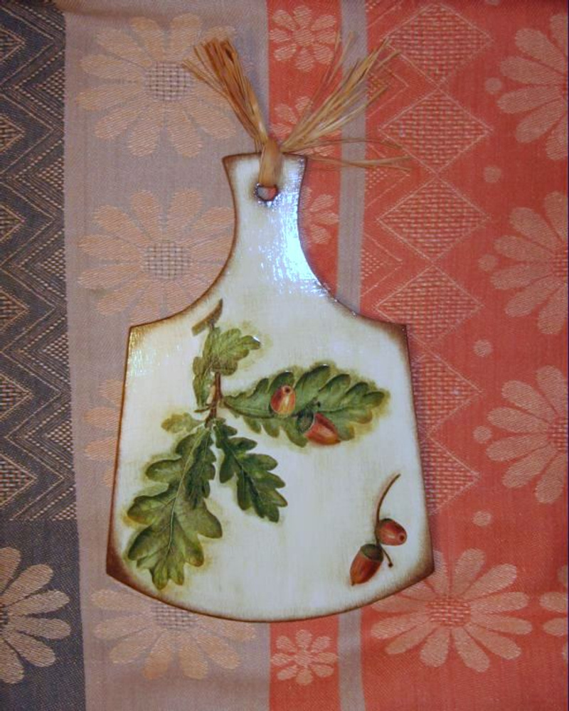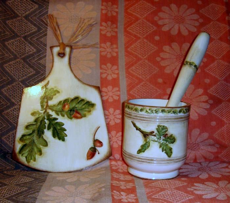 Досочка предназначена для декоративных целей. Ступка – декорирована только снаружи, а внутри можно использовать по назначению. Материал - дерево. Размеры: досочка - высота 20см(вместе с ручкой) х 14см; ступка - высота 9см, диаметр 8см.
