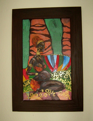 Картина выполнена в традиционных цветах для африканского стиля, цвета природные натуральные, теплые. Есть яркие цветовые фрагменты , которые создают акценты. По цветам я постаралась сделать символичные оттенки - зеленый, доминирующий на картине - это символ новой жизни, рождения, обновления.