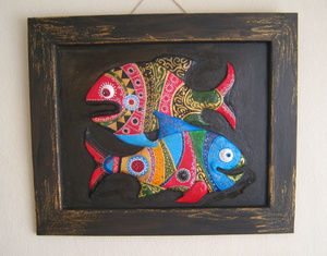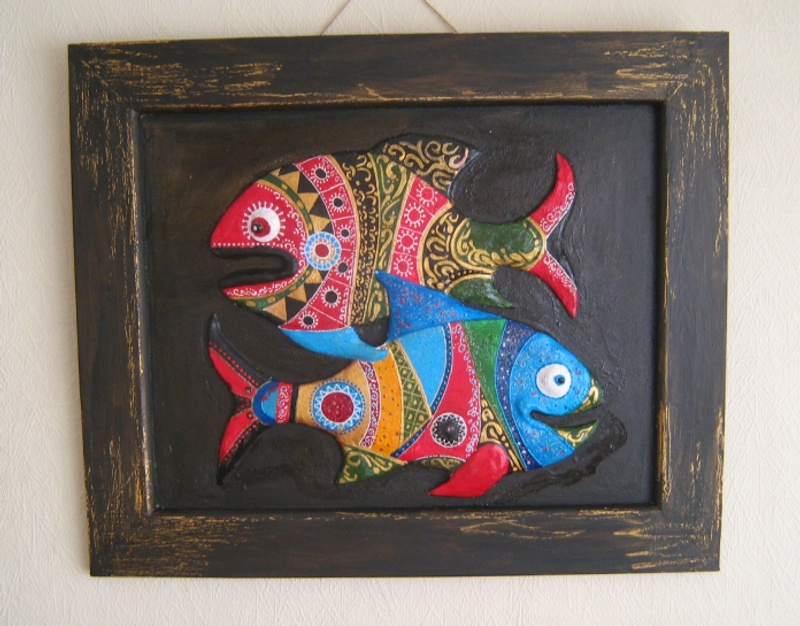 Два объемных карпа. Такой символ в доме очень хорош для людей, которые хотят обрести или сохранить любовь. Две рыбы связаны друг с другом, это способствует укреплению сввязи двух половинок, а одиноким помогает обрести любовь и создать брачный союз. Лучше всего разместить эту картину в юго-западной части квартиры - в зоне семьи и брака.