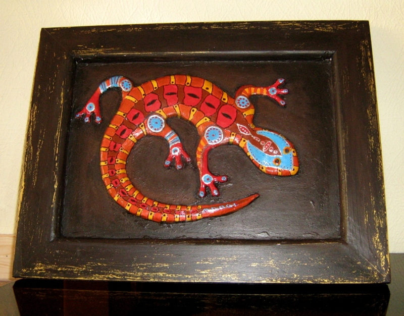 Картина с объемной ящерицей. В широкой деревянной раме, рама искусственно состарена под черное дерево с позолотой
