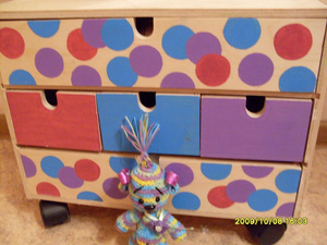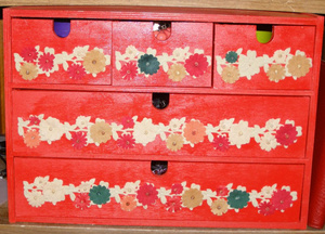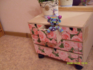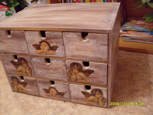 Если те, про которые я думаю: с выдвижными ящичками - я покрасила всё и фронтальную поверхность украсила тесьмой красивой. Была еще идея использовать кружево, у меня комодик красный и черное кружево было бы неплохо!