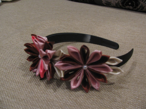 из органзы вырезаю три одинаковых кружочка-это на один листик под цветок, на свече надо оплавить концы, они красиво загибаются, потом два кружочка складываю пополам, а один в четверть и скрепляю все три под углом 120 гр., приклеиваю на основу, а сверху приклеиваю цветок. Следующий цветок-все также, только приклеиваю близко к предыдущему, чтобы органза находила друг на друга, тогда получается пышный шарик