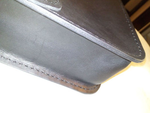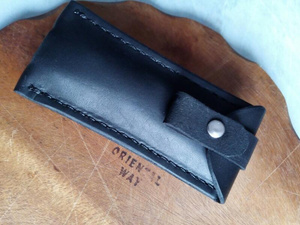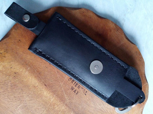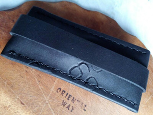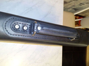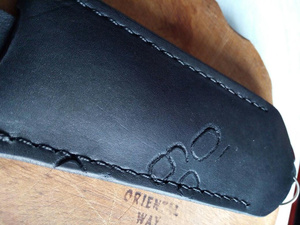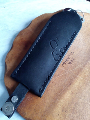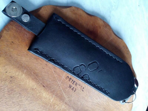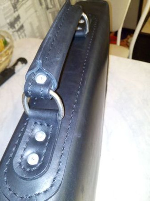 Шил так. Сначала сделал небольшой чертеж на листочке с размерами. Потом на шкуре (без выкройки) разметил детали. Вырезал все. Склеил. Разметил обычной столовой вилкой места под стежки, просверлил шуруповертом отверстия и сшил) Это если вкраце) Беда у нас в городе с фурнитурой. Не нашел застежку, какую хотел. Не нашел нужного размера хольнительны (заклепки в общем) - пришлось клепать ручку строительными.