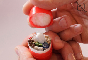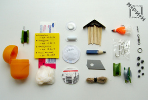 В капсулу от шоколадного яйца добавлен набор выживания (см. список). Капсула основательно герметизирована широким скотчем. Плетение - "Кулак обезьяны".