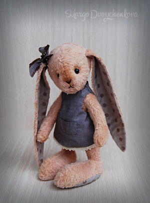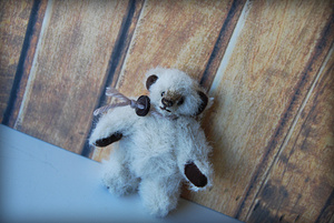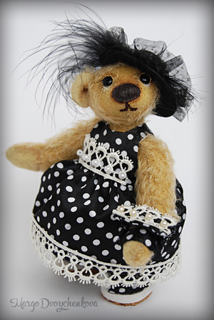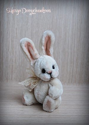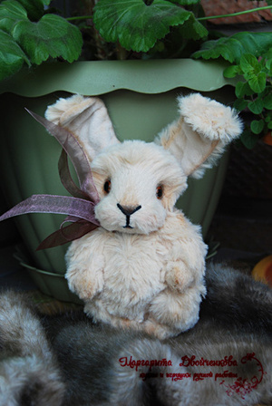 Выполнена из очень мягкого и тискательного искусственного меха Schulte приятного молочного цвета, набивка синтепух, утяжелена металлическим гранулятом, глазки стекло, 6 шплинтов, тонировка художественным маслом, сухой пастелью и текстильным маркером.