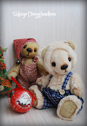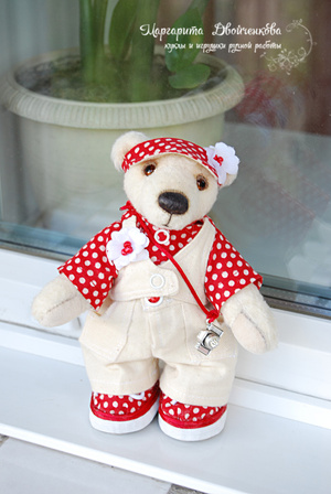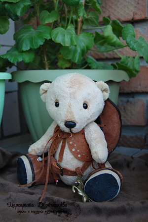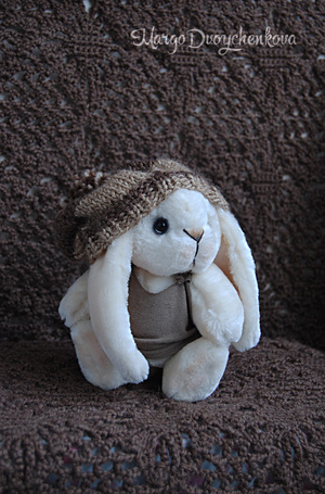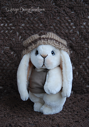Зефирчик выполнен из искусственного меха Schulte, набивка синтепух, утяжелён металлическим гранулятом, 6 шплинтов, глазки стеклянные, затонирован художественным маслом. Одет Зефирчик, как и Тася, в "хипповскую" маечку и вязанную шапочку с помпоном.