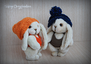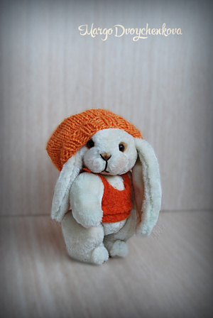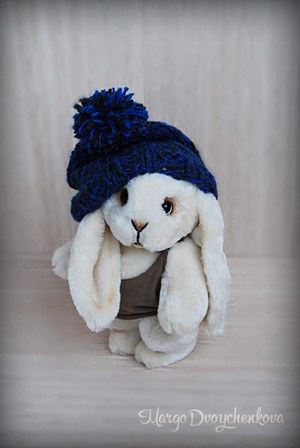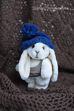 Зая одета в маечку из трикотажа и вязанный беретик с помпоном.